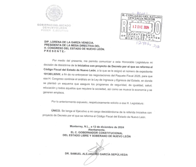 El documento se presentó en la Oficialía de Partes del recinto Legislativo. Monterrey, Nuevo León.- El Consejero Jurídico del Titular del Poder