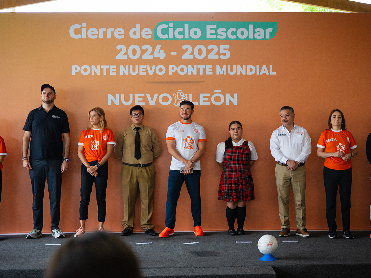Monterrey, Nuevo León.- A ritmo del Mundialito, el Gobernador del Estado, Samuel Alejandro García Sepúlveda encabezó la ceremonia de cierre del Ciclo Escolar 2024-2025, en el que más de un millón 56 mil alumnas y alumnos de Educación Básica concluyeron sus clases.