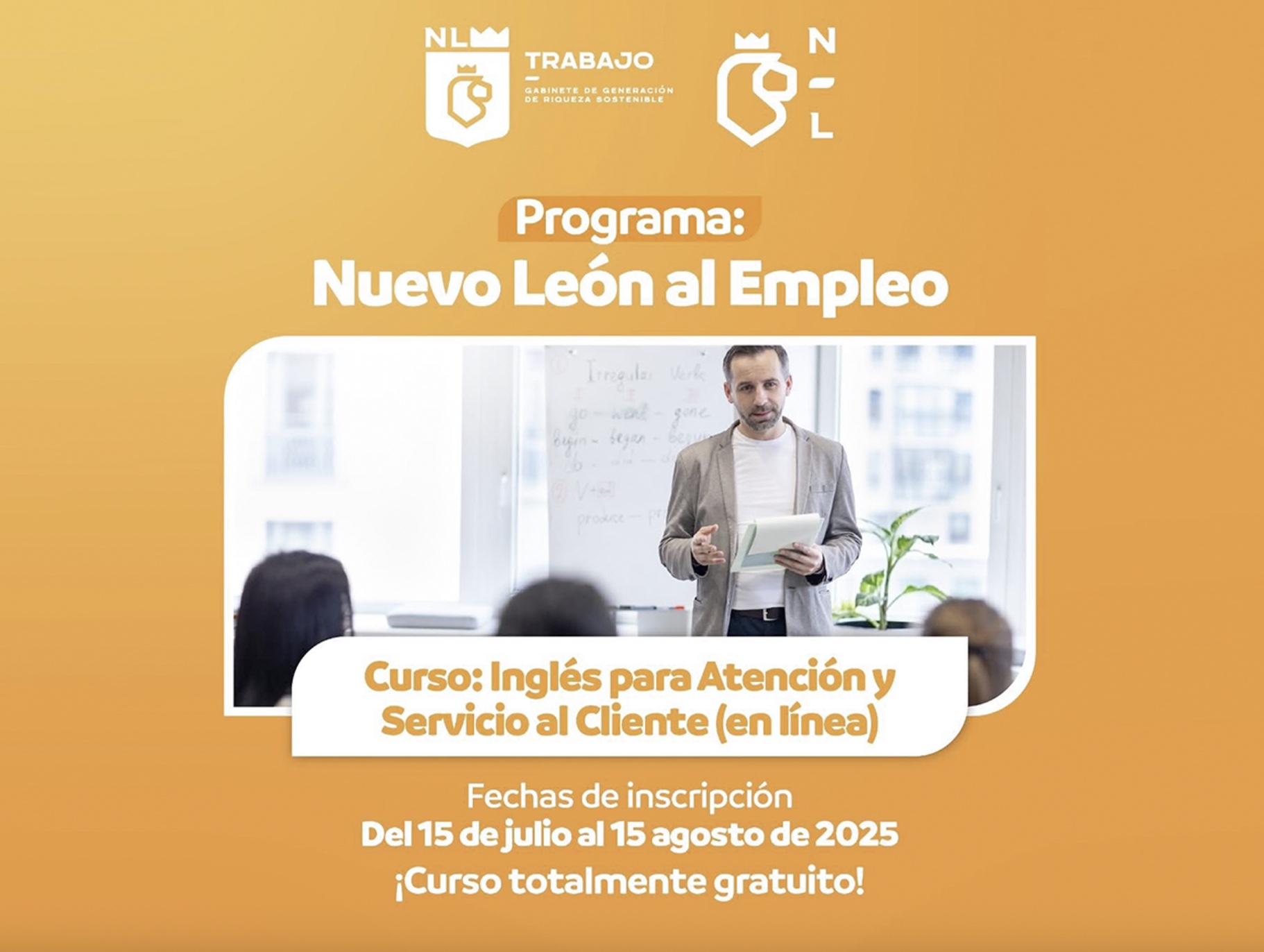 Las inscripciones están abiertas del 15 de julio al 15 de agosto, y pueden realizarse directamente en línea a través del siguiente enlace: https://cutt.ly/nuevoleonalempleo-ingles.
