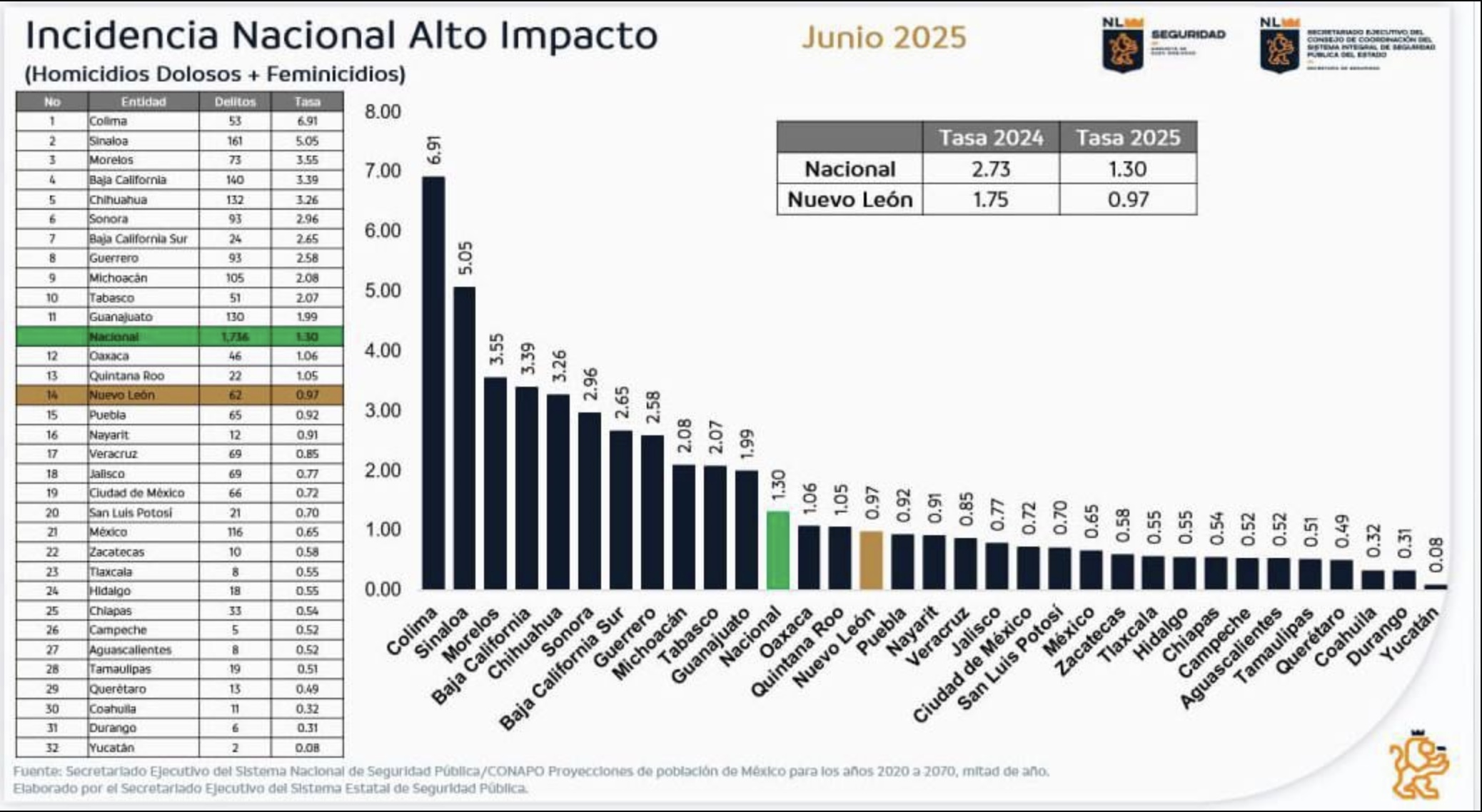 En cuanto a la estadística de homicidios dolosos y feminicidios del primer semestre de este año 2025, Nuevo León ocupa el sitio número 14.