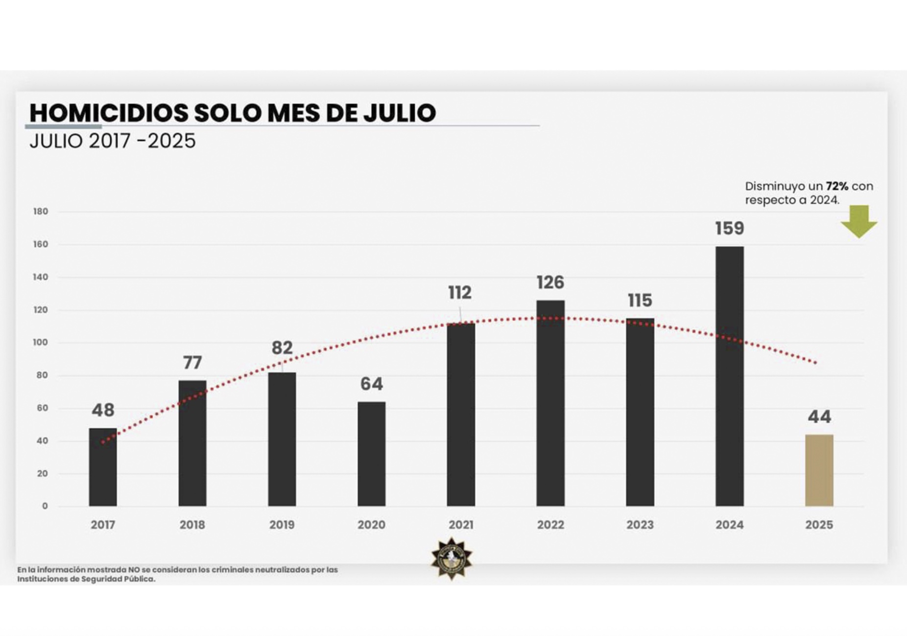 Asimismo, en el mes de julio, este delito registró un descenso del 72 por ciento comparado con el mismo mes pero del año pasado.