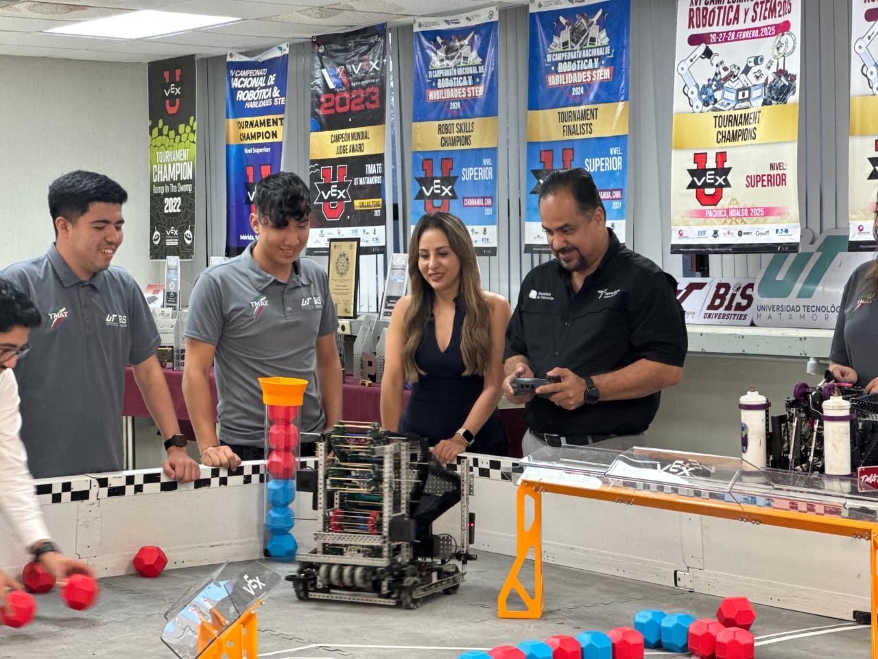 Crespo Solís visitó la Universidad Tecnológica de Matamoros, en donde, acompañado por su rectora, Diana Masso Quintana, recorrió las instalaciones, conoció los programas académicos que se imparten y sostuvo encuentros con estudiantes, quienes le presentaron sus proyectos de robótica y sistemas, destacando la creatividad y el talento de la juventud matamorense.