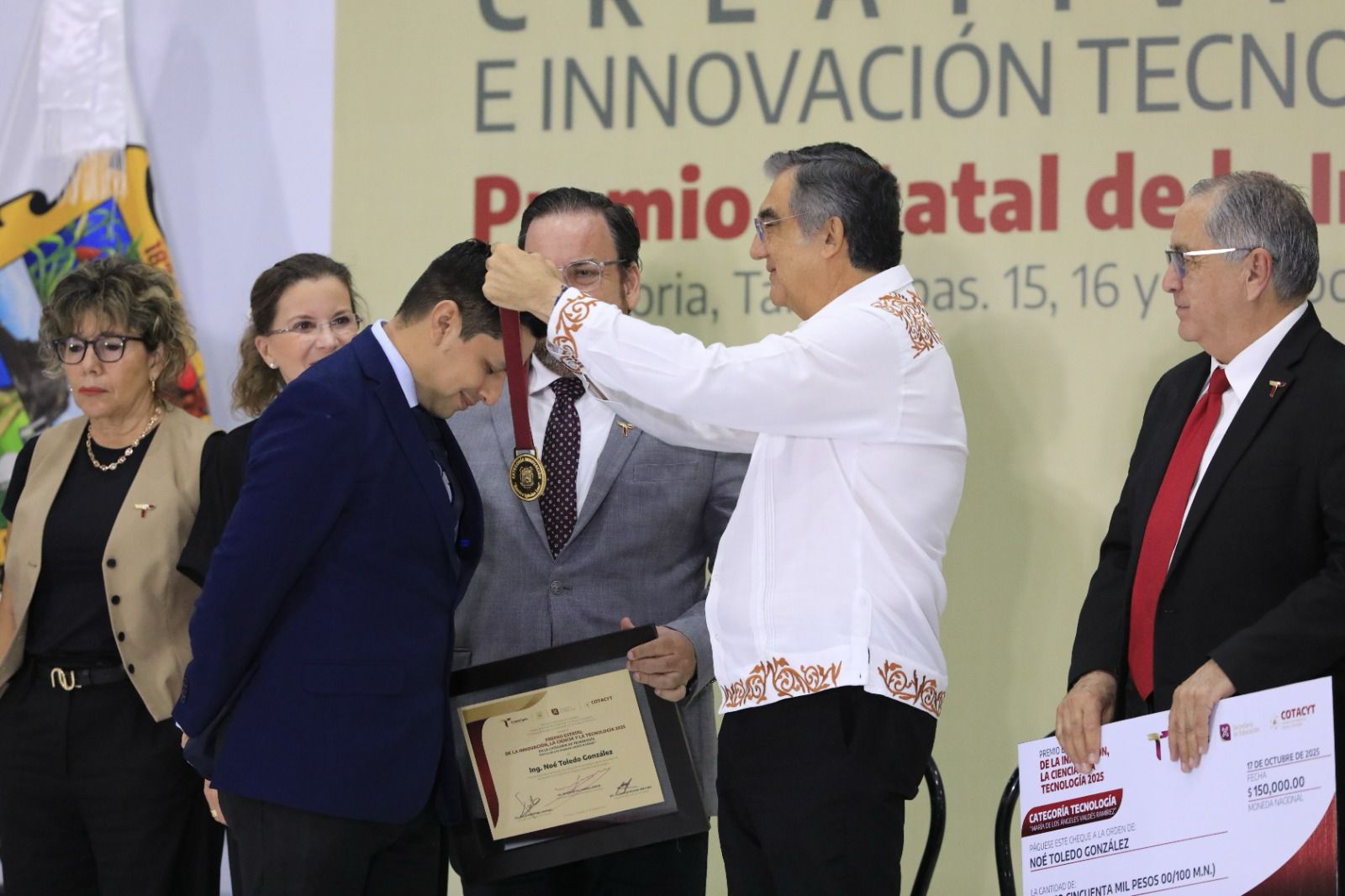 El gobernador Américo Villarreal Anaya hizo entrega de la Medalla “Ramiro Iglesias Leal” al ganador del Premio Estatal de la Innovación, la Ciencia y la Tecnología 2025 en la categoría de Innovación, el Dr. Edgar Tello Leal de la Facultad de Ingeniería y Ciencias de la Universidad Autónoma de Tamaulipas; de la Medalla “Ruy Pérez Tamayo”, al ganador en la categoría de Ciencia, el Dr. Gaspar Manuel Parra Bracamonte del Centro de Biotecnología Genómica del Instituto Politécnico Nacional, y en la categoría de Tecnología, la Medalla “María de los Ángeles Valdés Ramírez”, al Dr. Noé Toledo González de la Universidad Tecnológica de Matamoros.