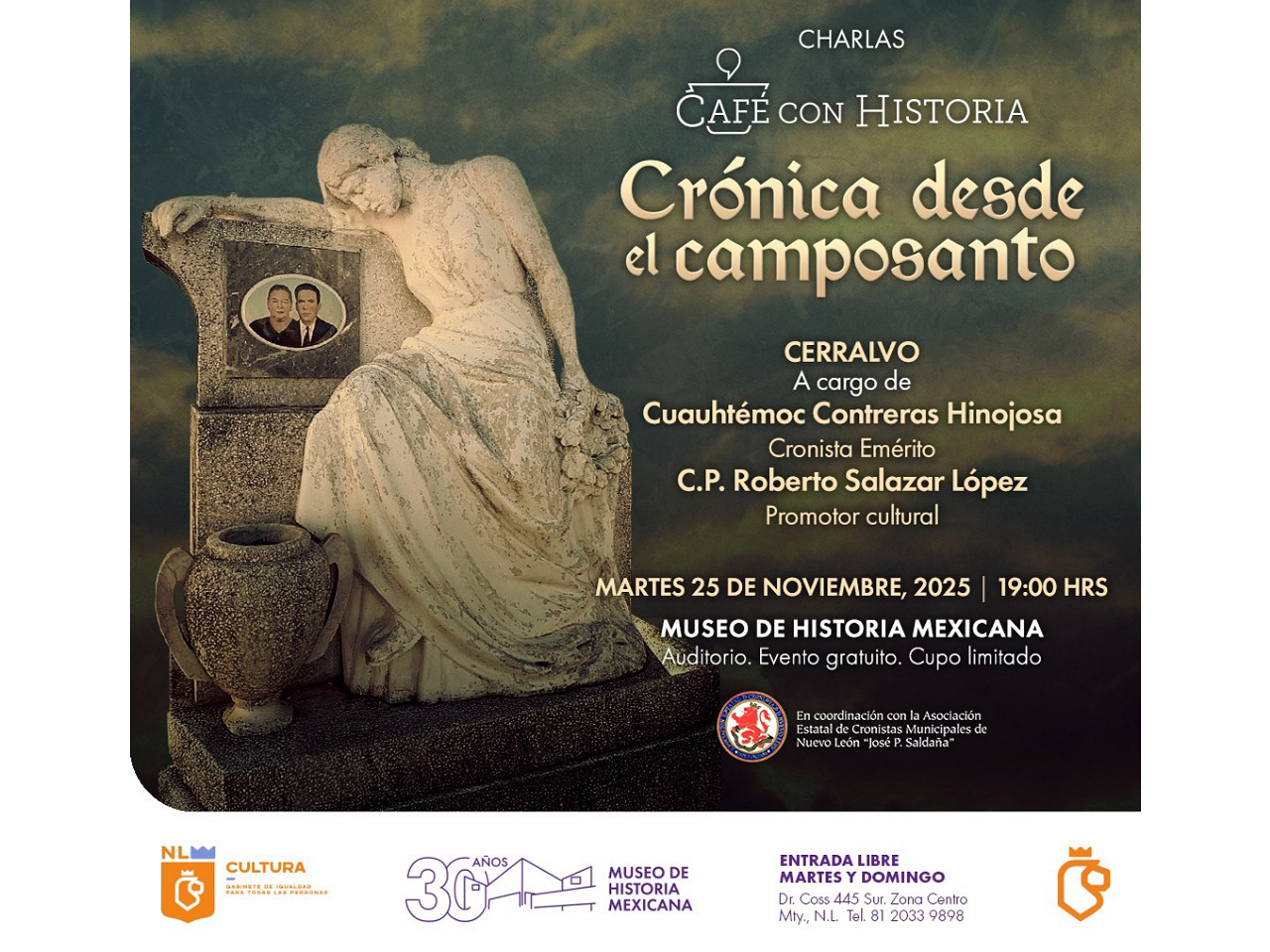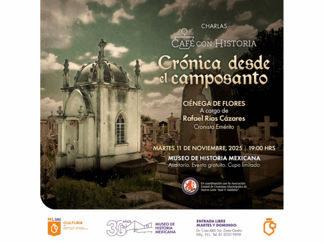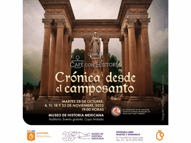 Monterrey, Nuevo León.- Los panteones son archivos al aire libre que entrelazan memoria, arte y tradiciones. Sus lápidas, esculturas y mausoleos cuentan las vidas de personajes ilustres y anónimos, revelan costumbres funerarias y hablan de una sociedad que honra la muerte como parte de la vida. Con esta visión se llevará a cabo Café con Historia. Crónica desde el camposanto, los martes del 28 de octubre al 25 de noviembre a las 19:00 horas en el Auditorio del Museo de Historia Mexicana.