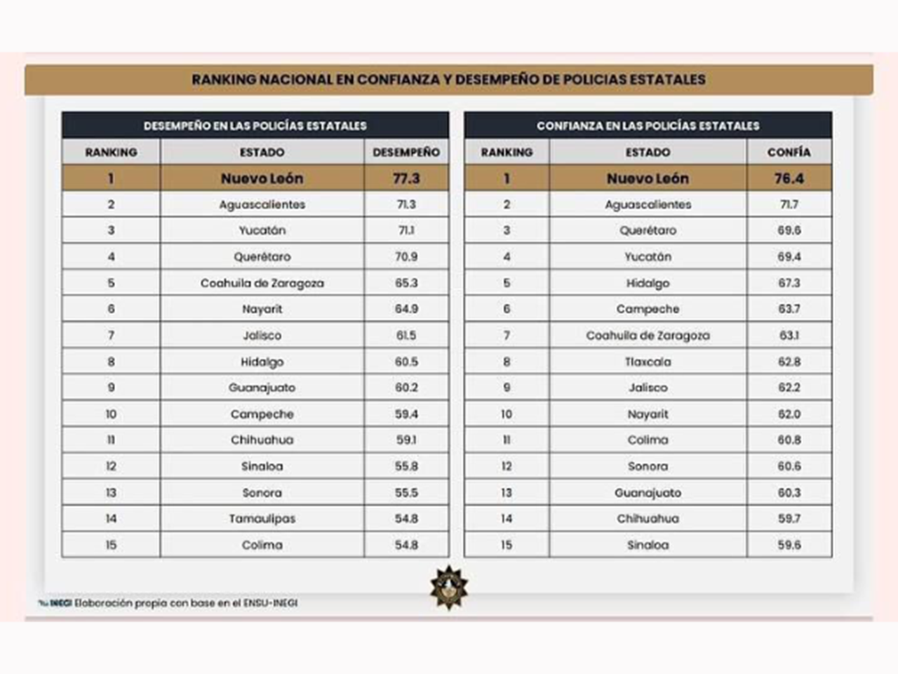 En la edición correspondiente al  tercer trimestre de 2025, en la que se incluyen 7 municipios urbanos de Nuevo León, Fuerza Civil mantuvo el primer lugar en desempeño, al promediar un 77.3 por ciento de la población que la considera efectiva, frente al promedio de 76.2 registrado en el trimestre pasado.
