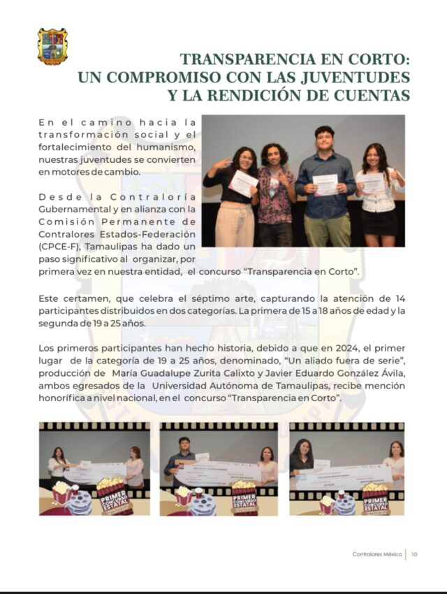 Ciudad Victoria, Tamaulipas.- La Secretaría Anticorrupción y Buen Gobierno del Estado de Tamaulipas (SABG), dirigida por Norma Angélica Pedraza Melo, fue reconocida en la edición número XI de la revista Contralores MX 2025 por su primera experiencia institucional en el certamen “Transparencia en Corto”, una iniciativa que busca fomentar valores cívicos a través del arte audiovisual.