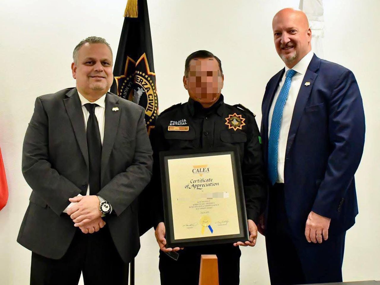 Durante la ceremonia realizada en la Sala Principal de Juntas del Campo Policial No. 1, el Director Ejecutivo de CALEA, Craig Hartley, Jr., reconoció el trabajo, disciplina y liderazgo de la corporación estatal, destacando que Nuevo León se ha convertido en un referente nacional en materia de seguridad pública.