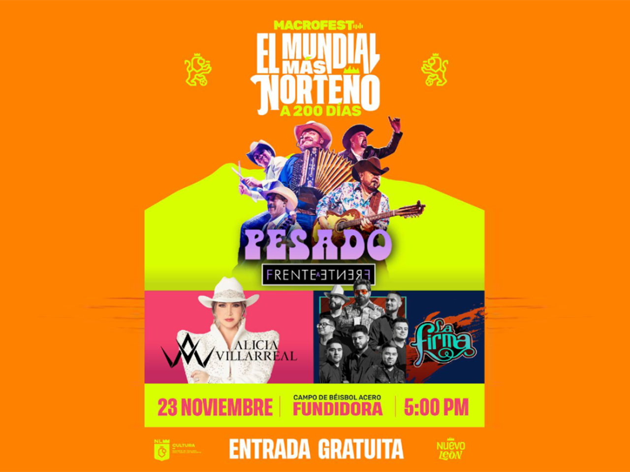 - Pesado, Alicia Villarreal y La Firma encenderán el escenario en el Campo de Béisbol Acero Fundidora; la entrada es completamente gratuita.