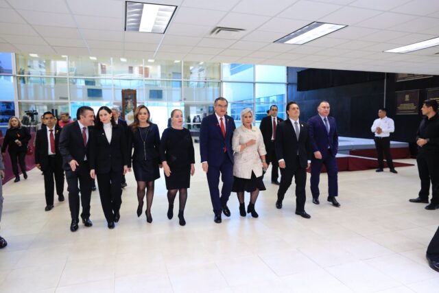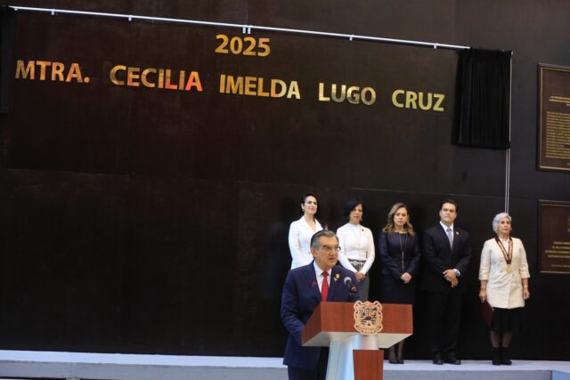 Al término de la ceremonia en el Salón de Sesiones, el gobernador acompañado también por la titular del Poder Judicial, Tania Contreras y de la presidenta de la Mesa Directiva del Congreso, Eva Reyes, develó el nombre de la maestra Cecilia Lugo, inscrito con letras doradas en el Muro de Honor al Mérito “Luis García de Arellano”.