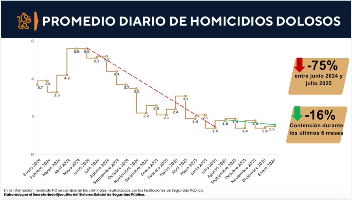De acuerdo a los datos revisados en la reunión de esta mañana, los primeros 13 días de enero registraron 20 homicidios, contra los 33 registrados en el mismo periodo del año 2025. Esto implica que el promedio diario de homicidios se mantuvo en 1.5, promedio que se ha sostenido en los últimos 6 meses, y que implica 75% menos homicidios diarios que en el pico máximo registrado en mayo de 2024.
