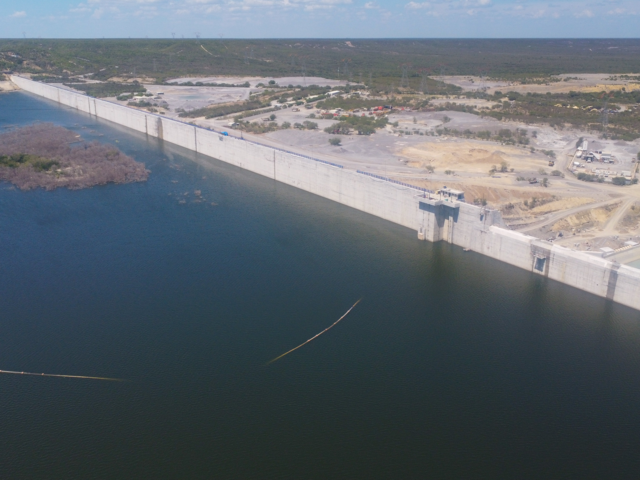 La presa, construida con concreto compactado con rodillo, cuenta con una cortina de mil 950 metros de longitud y una altura de 45 metros, lo que la convierte en la cortina más larga del continente.