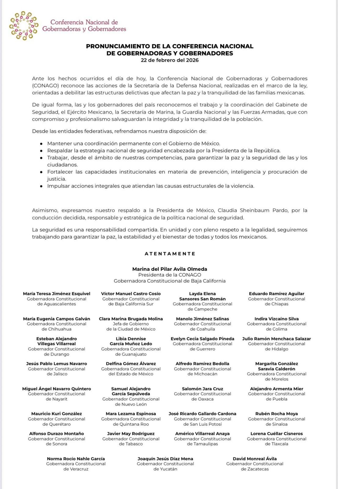 El pronunciamiento establece que, desde las entidades federativas, se mantendrá coordinación permanente con el Gobierno de México; se respaldará la estrategia nacional de seguridad; se fortalecerán capacidades institucionales en prevención, inteligencia y procuración de justicia; y se impulsarán acciones integrales para atender las causas estructurales de la violencia.