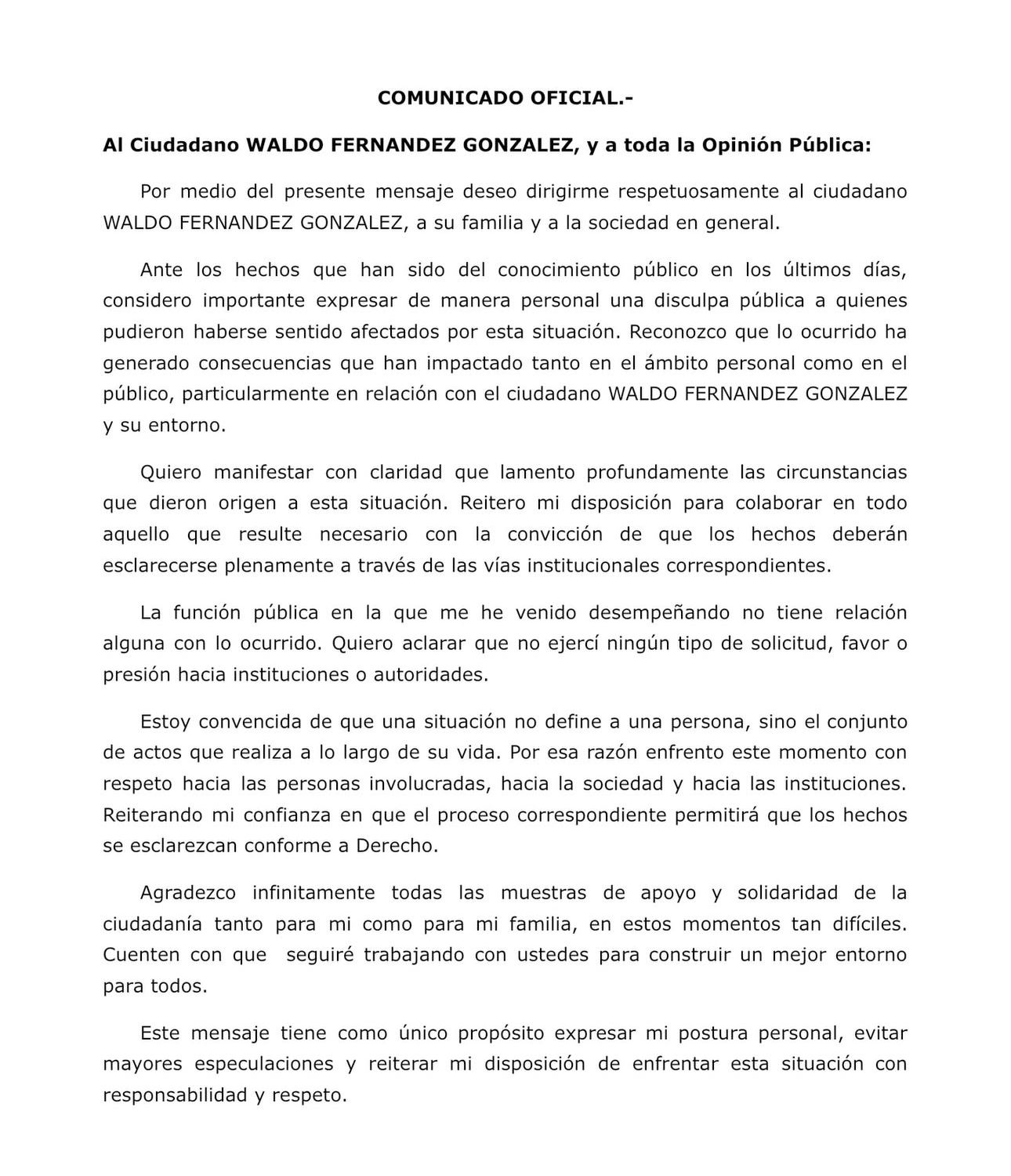 A través de un comunicado difundido en sus redes sociales, la funcionaria municipal dirigió un mensaje al senador, a su familia y a la opinión pública, en el que reconoció que la situación ha tenido repercusiones tanto en el ámbito personal como público.
